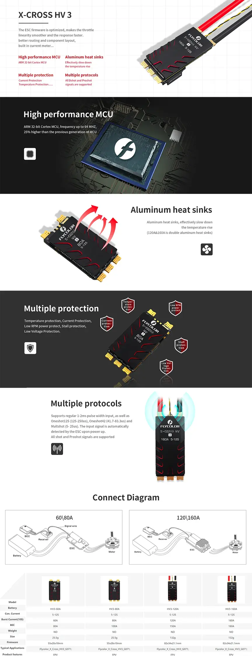 The X-Cross HV3 80A 5-12S ESC by Flycolor features quality MOSFETs, BLHeli_32 firmware, an ARM 32-bit Cortex MCU, Telemetry, and more!