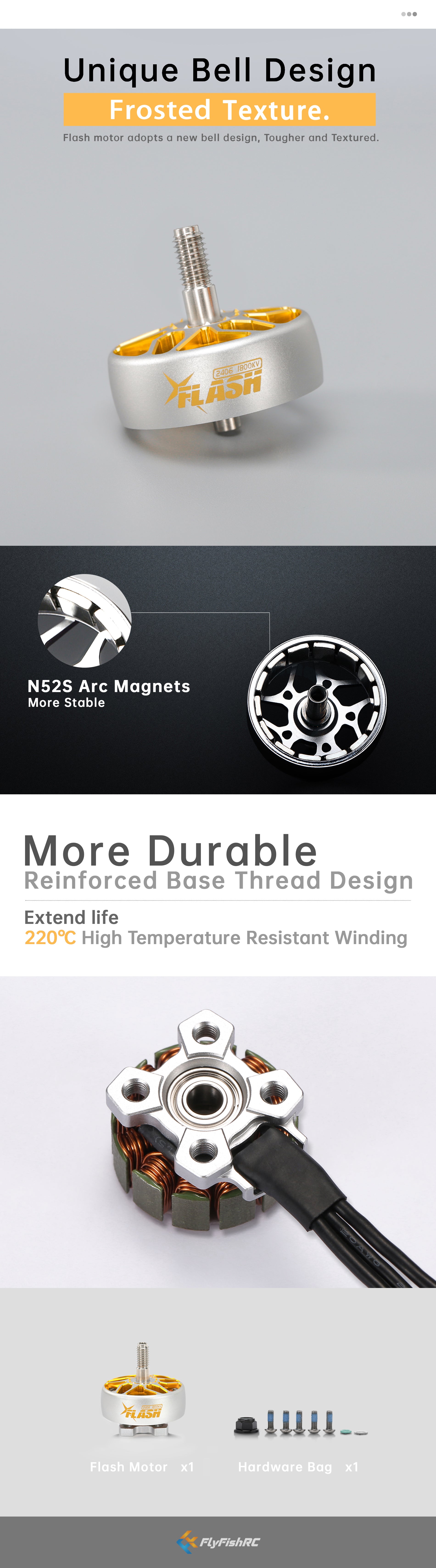 The FlyFishRC Flash 2406 Motor uses the Uni-Bell structure design providing high crash-resistance while not adding more weight, providing high reliability and explosive power and thrust for FPV pilots at an affordable price.