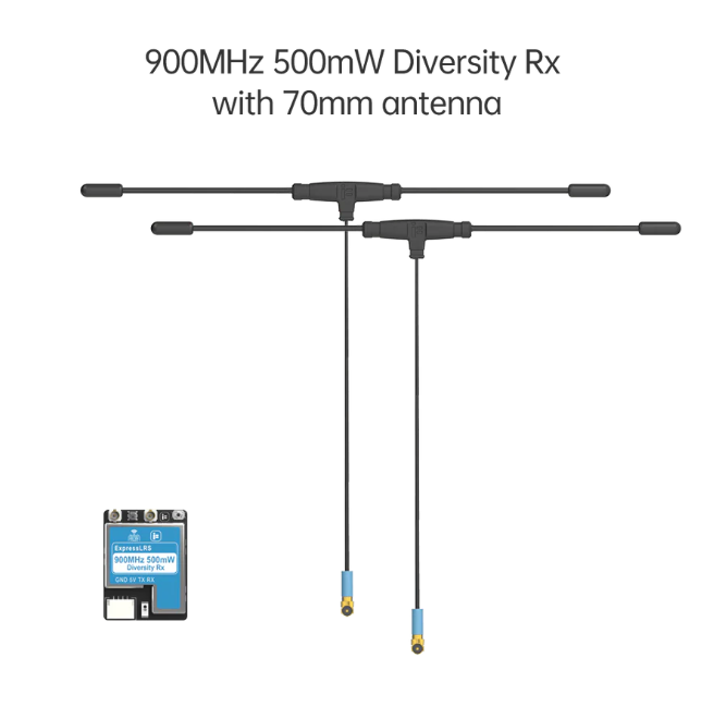 The ELRS diversity receiver features well-placed dual antennas with shielding covers, enhancing its resistance to interference, widening signal reception, and ensuring a more stable connection compared to conventional single-antenna receiver systems.