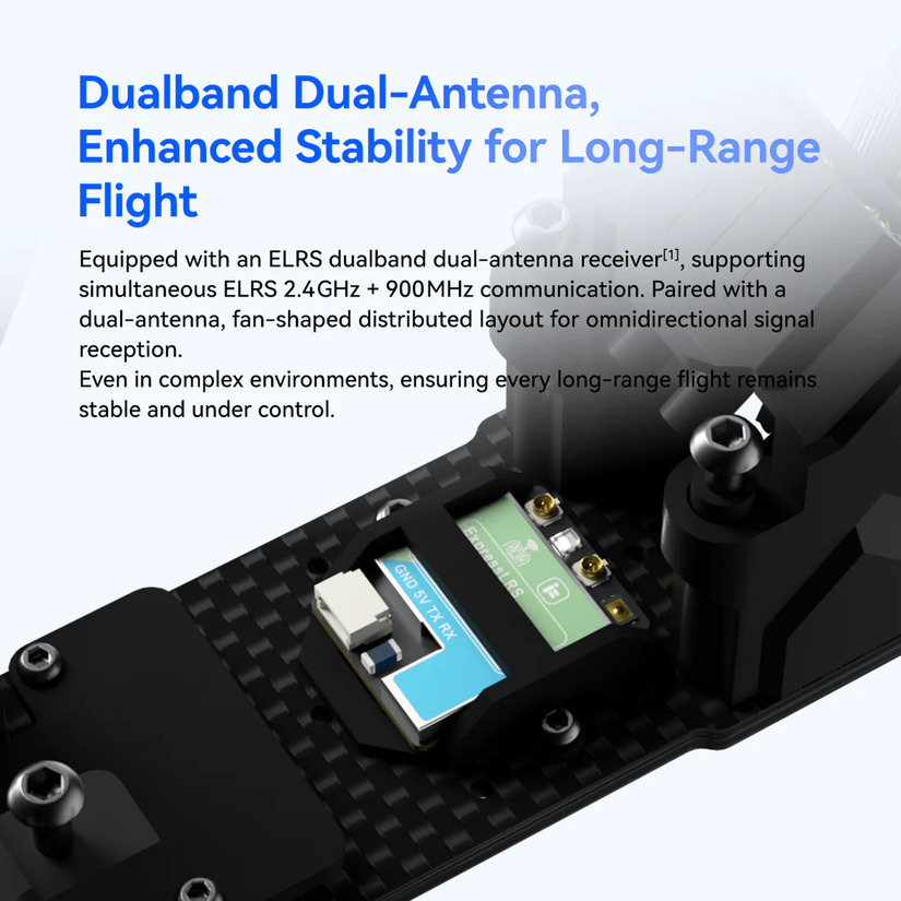 With an optional ELRS dualband dual-antenna receiver, supporting simultaneous 2.4GHz + 900MHz communication. Paired with a dual-antenna, fan-shaped distributed layout for omnidirectional signal reception, it ensures stable, controlled long-range flights even in complex environments.