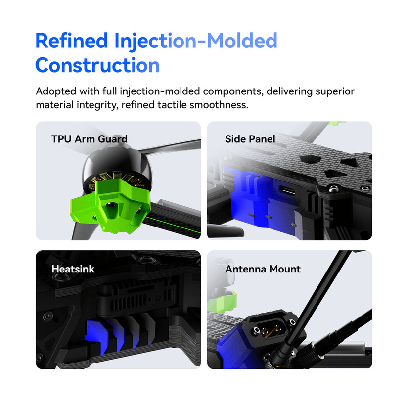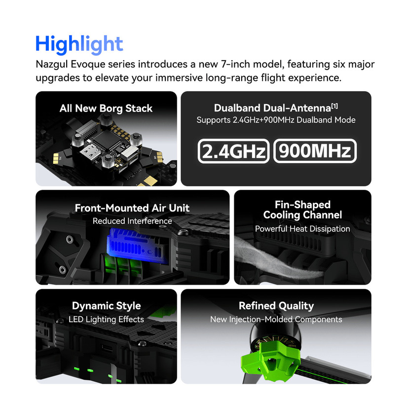 The fin-shaped cooling channel design enhances heat dissipation and ensures stable long-range flight performance. It comes with Dynamic LED effects full of recognition and technological sense.