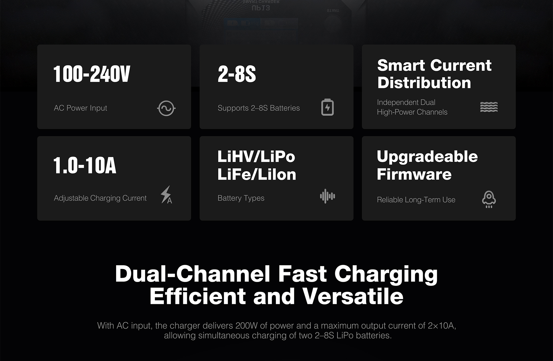 Theย Ultra Power UP13ย is a versatile, dual-channel AC smart charger designed for quadcopter pilots, drone racers, RC hobbyists, and enthusiasts. Its full-color 2.4โณ IPS screen shows real-time data, and the charger intelligently distributes a combined 200โฏW load between two batteries for efficient parallel charging.